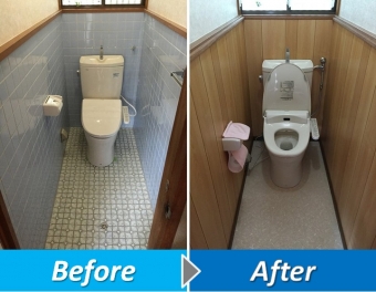 事務所内のトイレ工事をご紹介致します。こちらはトイレの内装工事のご用命でした。「トイレは既存のものを継続して使用したい。内装をタイルの冷たい感じから木目調の温かい感じの内装にしたい。」という社長様のご要望でした。床・壁のタイルを斫り、下地のレベルを調整して内装工事にとりかかります。内装工事が終了した後、社長様の最終確認を得て取り外したトイレを再び取付け、作業完了です。トイレ本体には不満はなく、内装だけをリフォームしたいというお客様は沢山いらっしゃいます。そうしたご要望に応えるられるのは水道業者ではなく、私達リフォーム会社です。