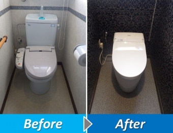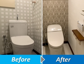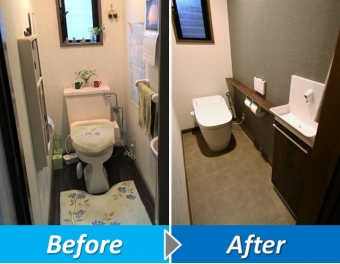 「タンクもトイレもウォシュレットも統一感がなく不満でした。」というH様。手摺も必要なくなり、今回思い切ってリフォームに踏みきりました。H様が以前利用した飲食店のトイレを参考にリフォーム致しました。今回はタンクレスのタイプを採用しとてもすっきりした空間に出来上がっています。また内装がブラック、トイレがホワイト、床を中間色のグレーでまとめてコントラストな配色がとても印象的なトイレの完成です。~工事内容~既存トイレ撤去処分/配管工事/給排水工事/新規トイレ工事/クッションフロア工事/クロス工事/巾木工事 他