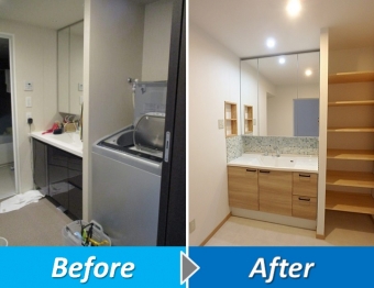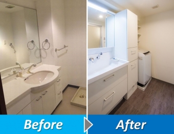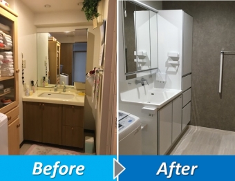 実はD様のお隣のお宅をリフォームさせていただいている時、偶然、D様にお声をかけていただいたことがご縁で工事をさせていただきました。洗面室自体は特に老朽はしておらず、まだまだ使用できましたが、ただもう少し使い勝手と見栄えを良くしたいとご相談いただきました。洗面台のボウルが前に突き出ていて狭い感じをうけるのと、洗面室を覗くと洗濯機がまず目立つので、洗濯機を洗面台に一緒に並べてスッキリさせたいとのご希望でした。その為、洗濯機パンの位置を洗面室の奥角に移動し、向きを切り返し洗面台と並べて配置。洗面台もボウルが直線的なものをセレクトして、頭面が直線的に見えるように工夫を凝らしました。収納棚も併せて設置することができて使い勝手もアップしました。床材もクッションフロアからフロアタイルへ変更してシックな雰囲気に。施工前と比べて広くなった感じがしますね。