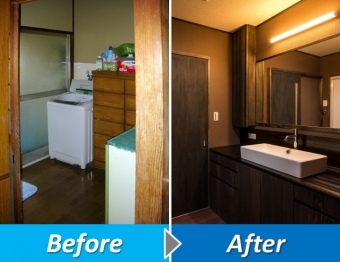 ダークブラウンを基調に落ち着いた雰囲気を演出しています。以前は実は、洗面室にはなんと鏡がなくてとても不自由でしたが、今回は大きく鏡を設置しました。洗面ボウルも奥様の身長に合わせ高さを調整。ご家族のイメージ通りに完成し、本当に良かったです。
